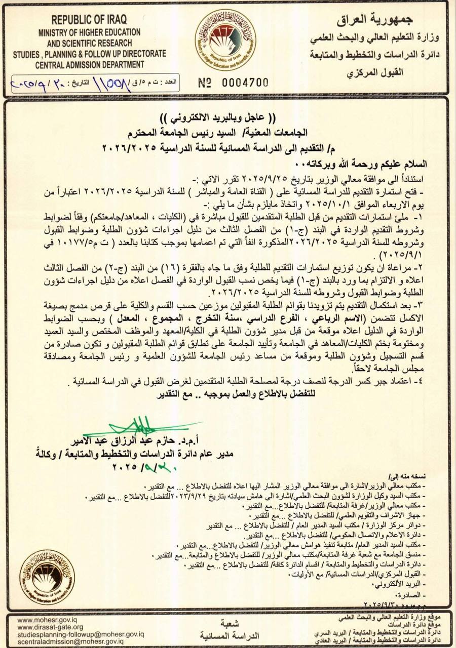 تعلن كلية علوم البيئة في جامعة القاسم الخضراء عن بدء التقديم للدراسة المسائية للعام الدراسي الجديد، وذلك اعتبارًا من يوم الاربعاء الموافق 2025/10/1 وتدعو الكلية الراغبين إلى مراجعة شعبة التسجيل في الكلية لتقديم طلباتهم وفق الضوابط والتعليمات الصادرة من وزارة التعليم العالي والبحث العلمي. ويأتي هذا ضمن سعي الكلية إلى إتاحة الفرصة أمام أكبر عدد من الطلبة لإكمال مسيرتهم العلمية في مجال علوم البيئة .